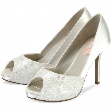 Fancy Wedding Shoes By Pink Paradox London have a covered platform and high heel, the front covered with lace and finished off with a peep toe.